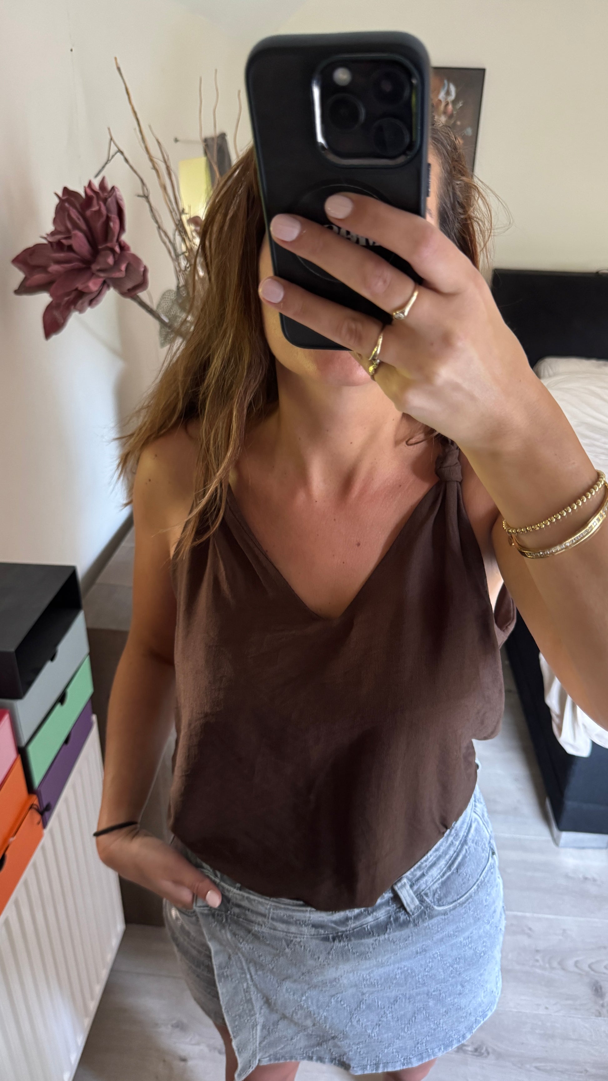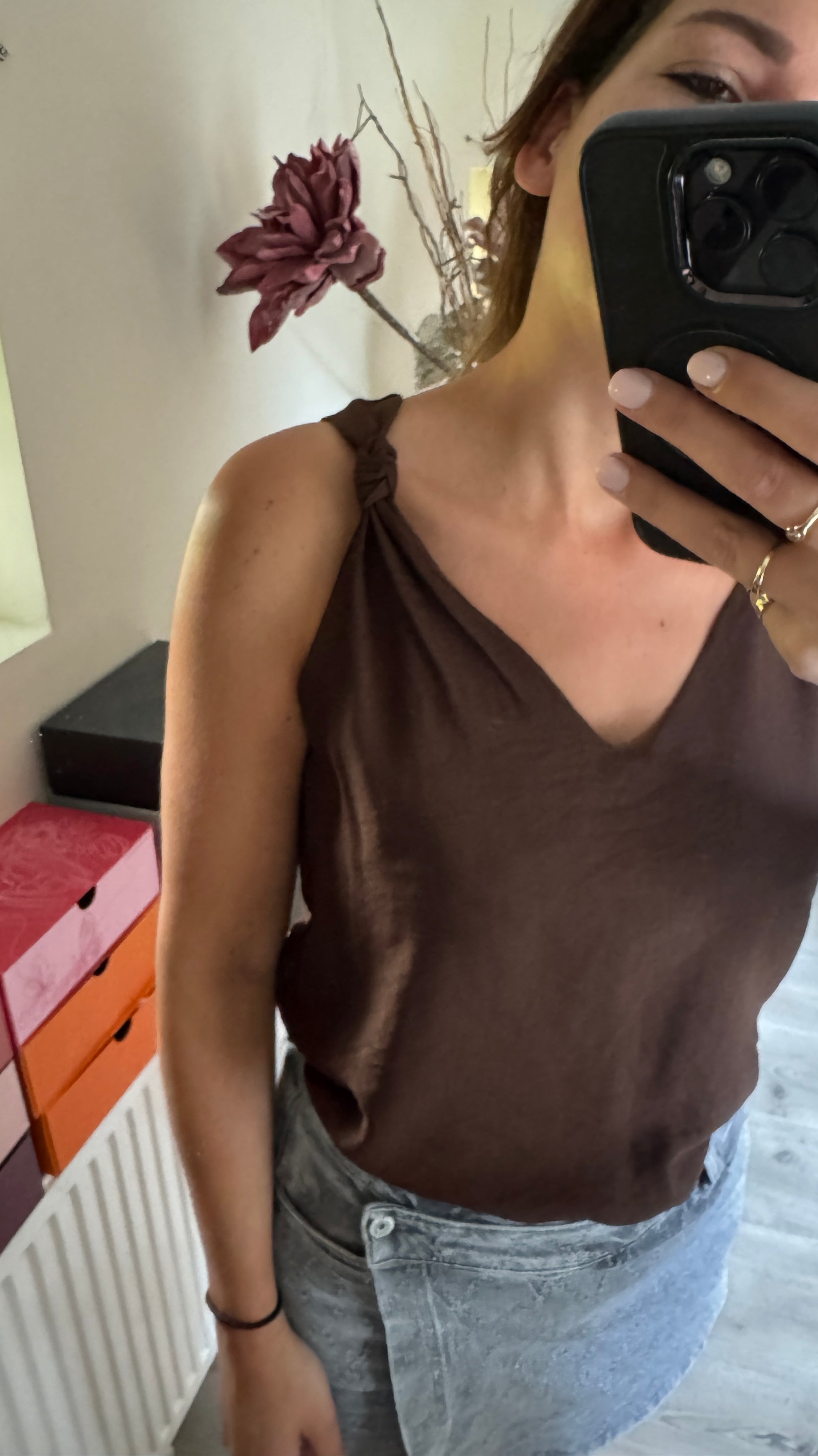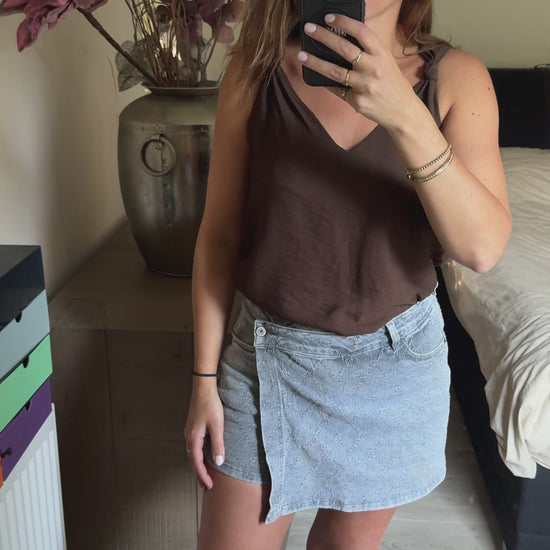 Een heerlijke luchtige top met een leuk detail op de schouder, een knoop. Verkrijgbaar in de kleuren choco, marine blauw, zwart, beige en wit.